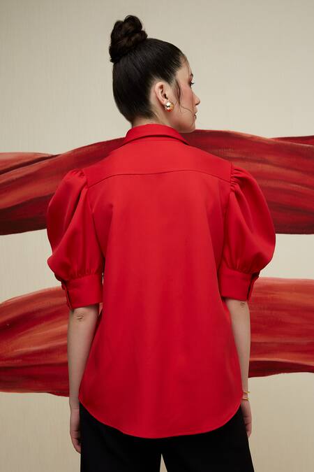 Bright red shirt featuring collared neck and lantern sleeves with placement cutdana beads hand embroidery