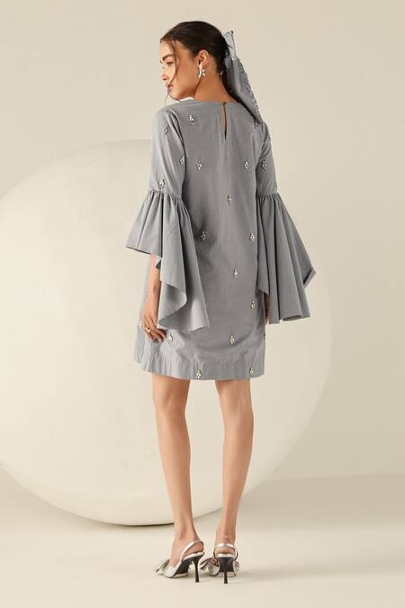 Blue Cotton Embroidery V-neck Leah Gingham Flared Sleeve Mini Dress