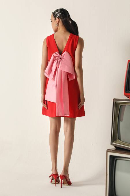 A red A-line dress crafted from Banana Crepe fabric, featuring intricate 3D floral appliques and subtle embellishments.