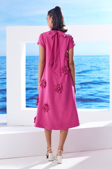 Hot pink midi dress featuring 3D embellished flowers in front and back with a tie-up high neck