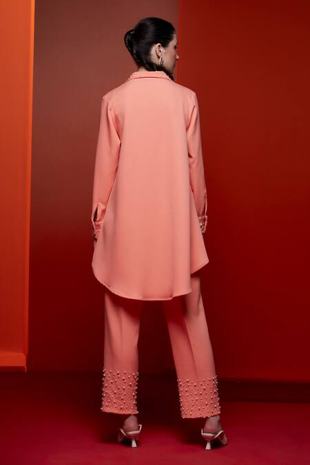 Peach high low shirt featuring pearl embroidery on the collar and cuffs