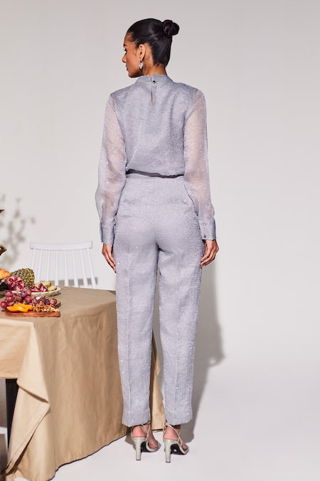 Grey crinkled organza top featuring sheer full sleeves and front panels. Paired with matching pants for a coordinated look.