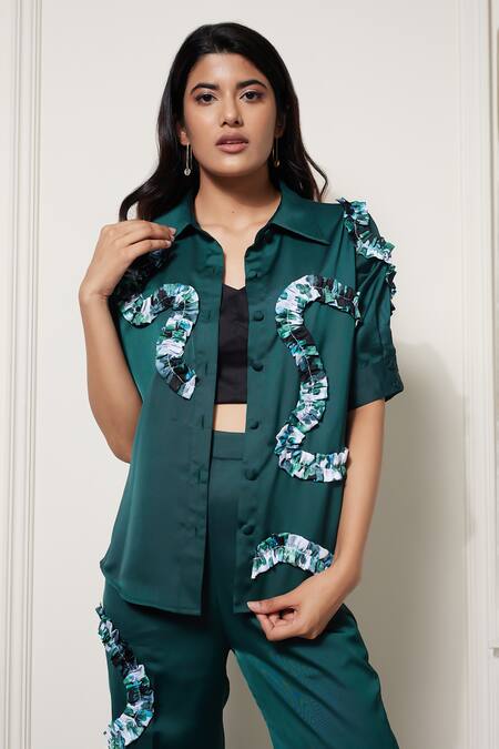 Green Satin Embroidery, Patchwork Rick Rack Printed Shirt And Pant Co-ord Set