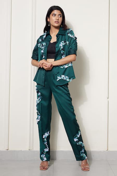 Bottle green luxury satin shirt featuring floral printed rick rack patchwork