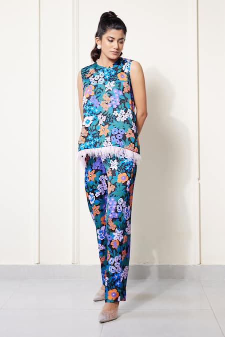 Multi-colored luxury satin top featuring a floral print and feather detailing at the hemline