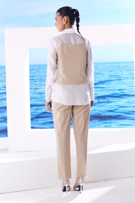 Beige Cotton Pearls Collared Sue Hue Embroidered Cuff Shirt With Camisole