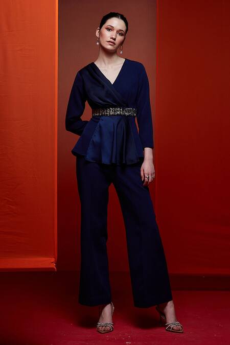 Navy blue peplum top featuring V-neckline and three-quarter sleeves with bead embroidery on the waist. Paired with matching wide-leg pants and an attached inner lining.
