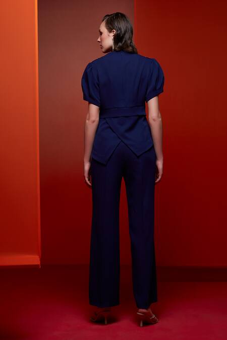 Blue Crepe Crystals, Stones V-neck The Emily Hand Embellished Top