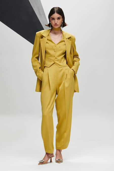 Olive waistcoat featuring a plunge-V neckline and scatter stone embellishments