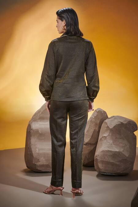 Brown shimmer shirt featuring turn and twist detailing with gold lace at cuffs and collar. Paired with matching straight fit pants with attached inner lining.