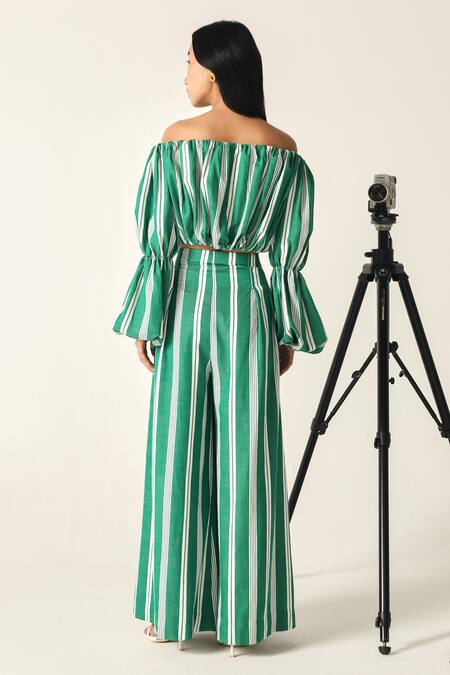 Green Cotton Off-shoulder Willow Striped Crop Top