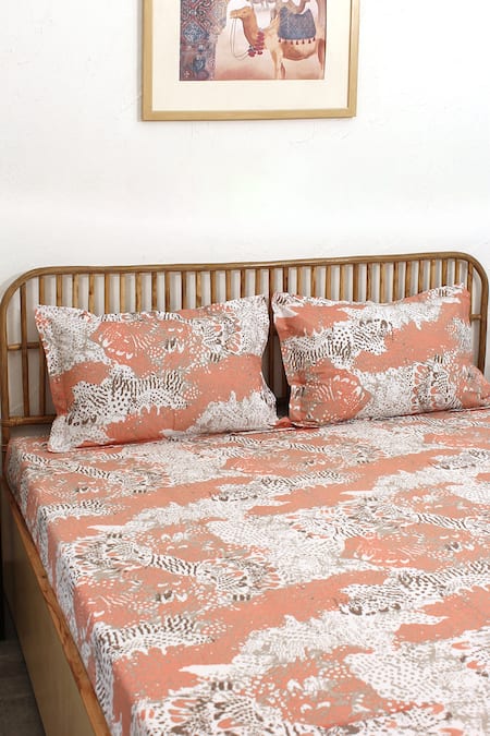 Pink king bed sheet in a cotton base with abstract print. Comes with two pillow covers.