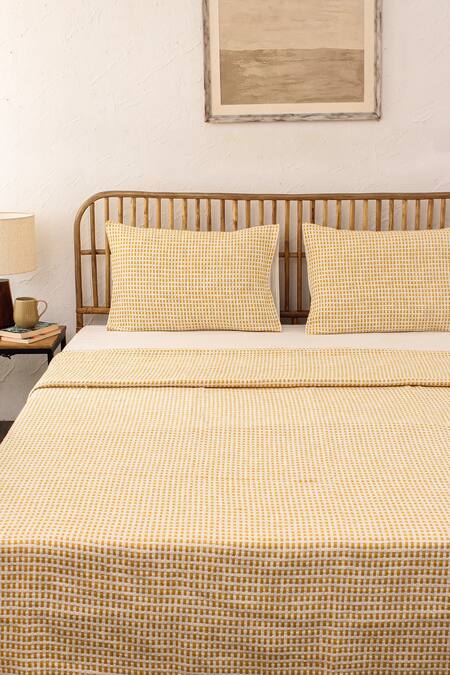 Yellow Cotton Woven Girnar Checkered Bedcover
