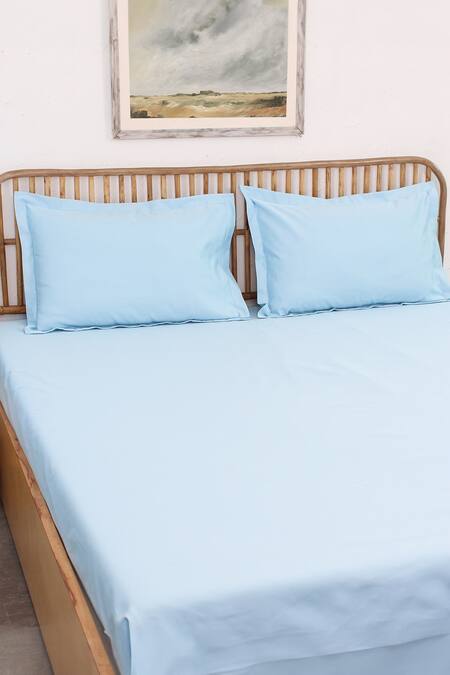 Blue fitted bedsheet with cotton satin base. Comes with 2 pillow covers.