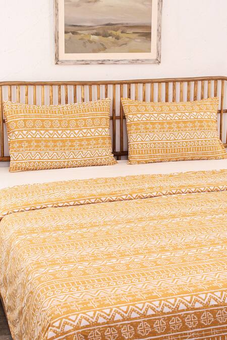Yellow Cotton, 60 Gsm Polyfill Ethnic Print Kullu Patti Stripe Dohar