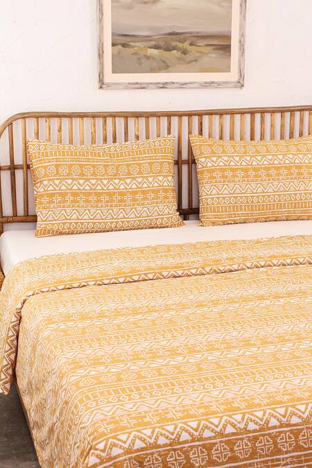 Yellow cotton duvet cover with all over contrast ethnic stripe print & envelope closure.
