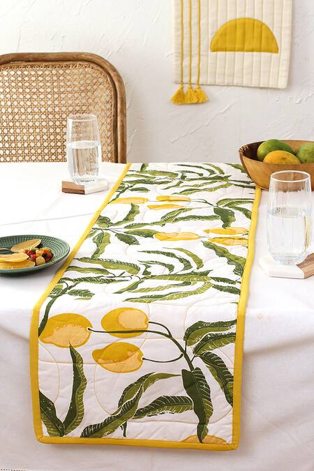Yellow set of 2 cotton table runners with mango prints, comes in a gift box.