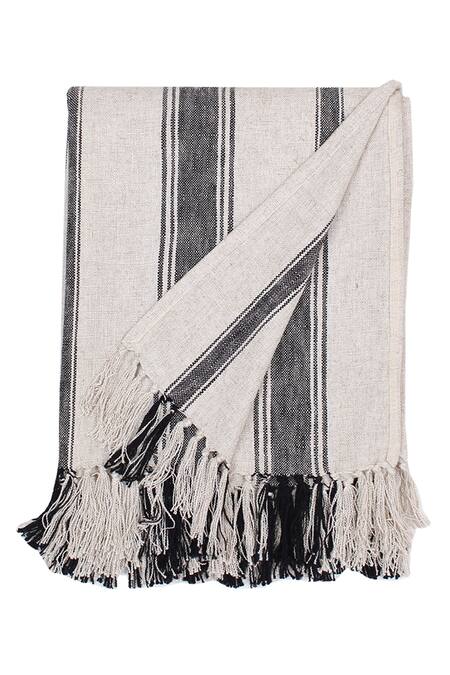 Natural & black cotton throw with all over woven stripe pattern & fringe tasselled hem.