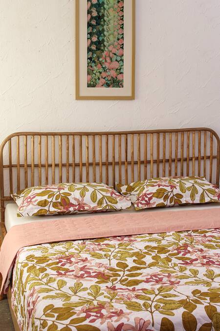 Pink double bedcover in cotton base with leaf pattern prints & quilted detail.