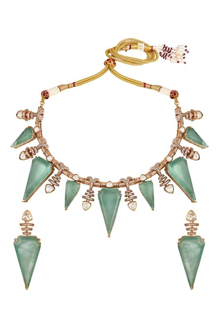 Geometric necklace set featuring clear and mint moissanite kundan polki, doublets, and zirconia embellishments. Includes a pair of matching earrings with push back clasp closure.