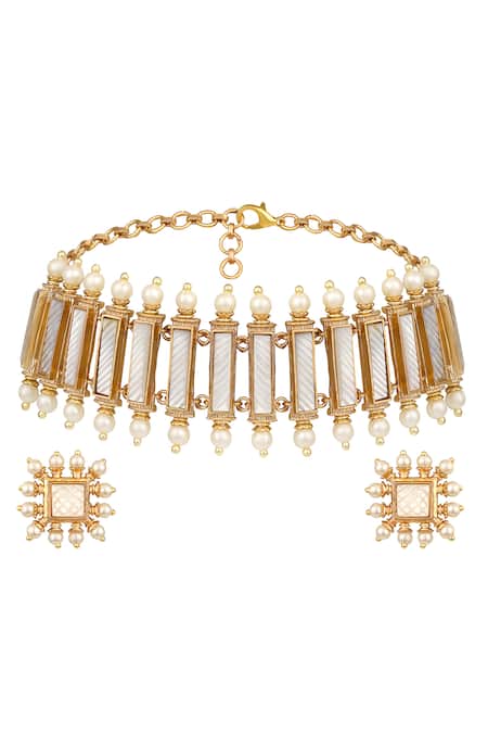 Gold and white designer necklace featuring mother of pearl and pearl embellishments. Paired with matching earrings adorned with natural stones.