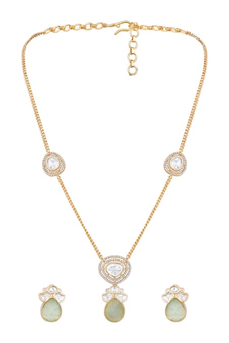 Mosanite kundan polki details on the necklace, Carved onyx pendant with intricate design, CZ diamond embellishments on earrings