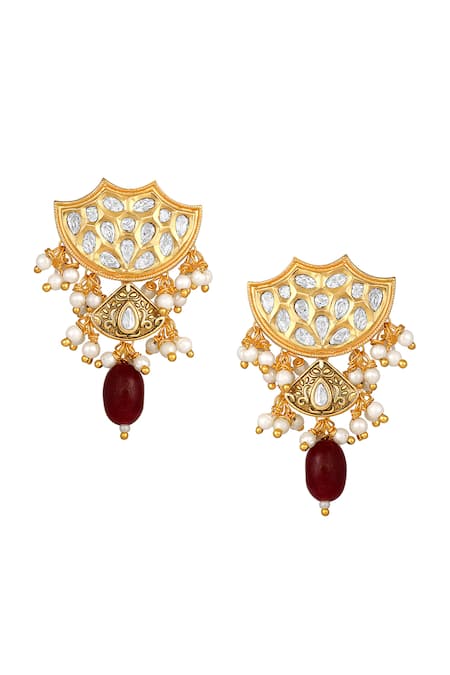 Gold plated geometric cutwork earrings featuring kundan, polki, agate tumbles, and pearl embellishments