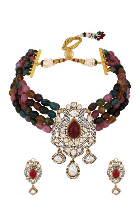 Multi Color Diamonds, Stones, Crystals Kundan And Polki Embellished Necklace Set