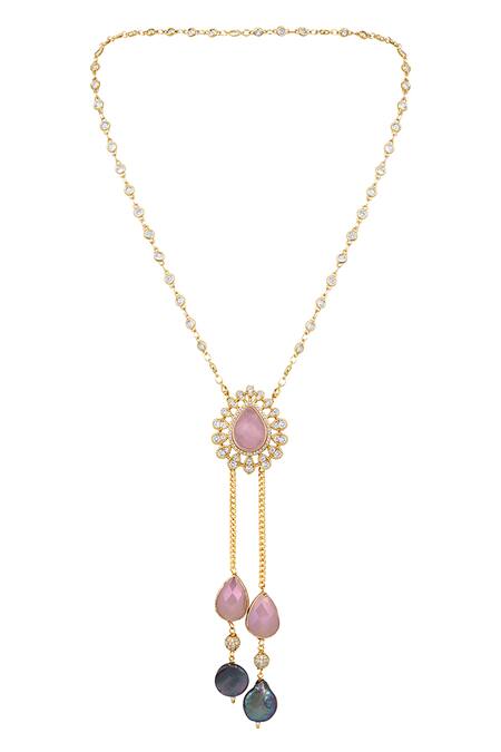 Gold plated pendant necklace featuring natural stone, fresh water pearl, and Italian crystal embellishments