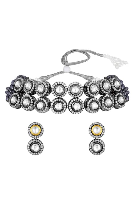 Gold polished brass choker embellished with kundan polki, cubic zirconia & Italian crystals. Paired with matching earrings featuring similar embellishments.