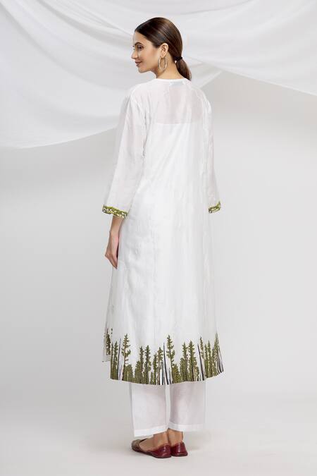 White straight long kurta with placement bird & tree motif work. Comes with plain slip, straight pants & organza silk yellow dupatta.