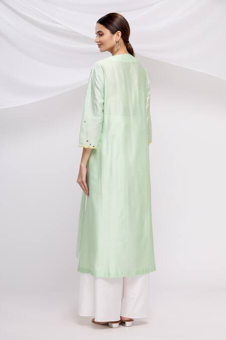 Mint green straight long kurta with all-over line thread work in jaal pattern. Comes with wide-legged white pants & scallop border floral embroidered dupatta.