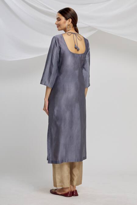 Grey Organza, Chanderi U Neck Pintuck Kurta Set