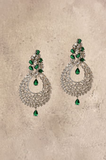 Silver based chandbali style earrings with green hydro stones & diamond embellishments.