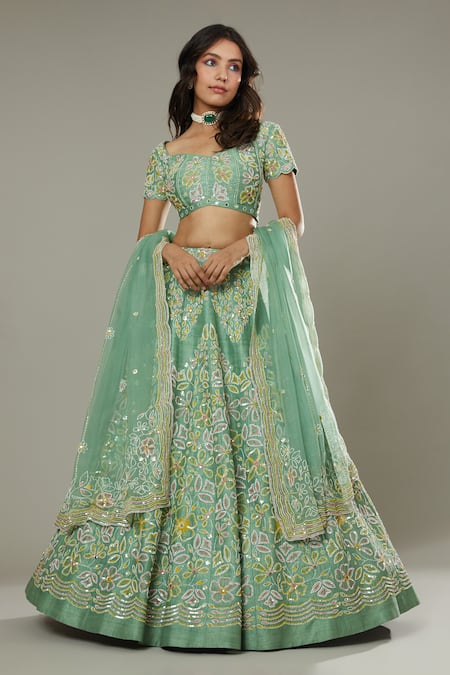 Green raw silk lehenga with attached cancan, featuring hand embroidered floral puzzle patterns with cutdana and colorful sequins. Comes with embroidered padded blouse and dupatta.