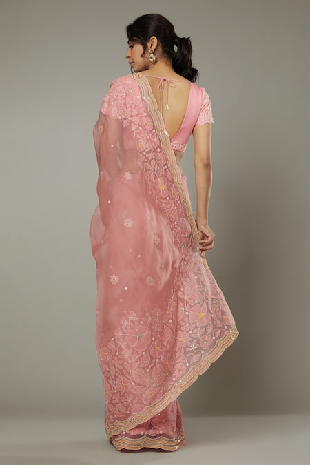 Candy floss pink silk organza saree with floral applique, hand embroidered with cutdana & colorful sequins in a floral puzzle pattern. Comes with floral embroidered padded blouse and a petticoat.