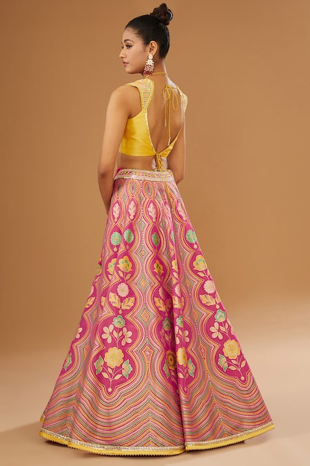 A hot pink silk zari blend lehenga featuring Leher hand-print and hand-embroidery with mirror and sequin embellishments. It is paired with a mustard blouse adorned with mirror and sequin work, and a matching hand-printed dupatta.