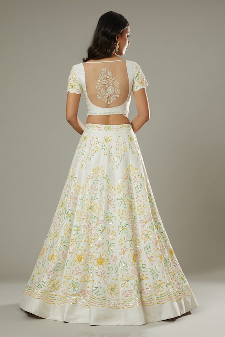 French vanilla ivory raw silk lehenga with attached cancan, featuring hand embroidered floral puzzle patterns with cutdana and colorful sequins. Comes with embroidered padded blouse and dupatta.