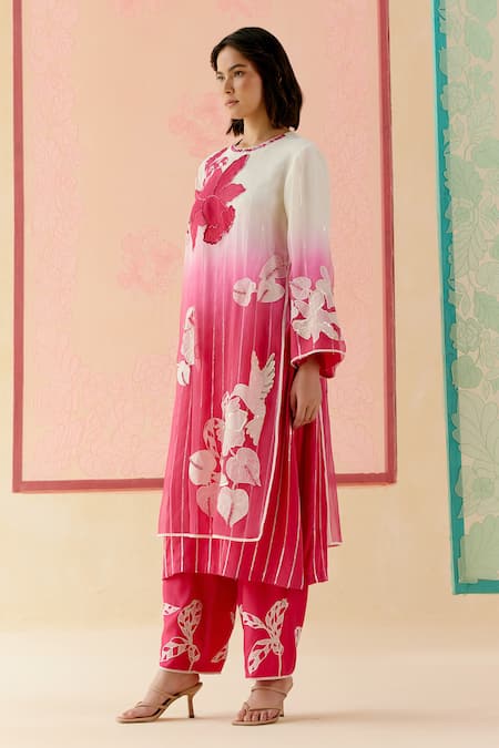 A hot pink and white silk organza layered ombre kurta crafted with delicate see-through applique work of flower petals and leaves, featuring subtle sequin stripes on the inner layer and hand-embroidered sequins and cutdana on the outer layer. It is paired with half-elastic appliqued pants.