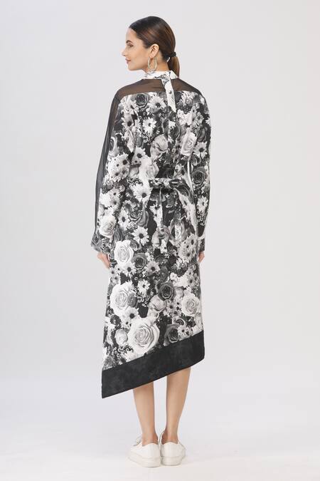 Black, white asymmetric dress with floral printed motifs, sheer panel, placement geomeric motif & front tie-up.