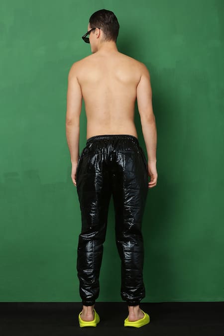 Black holographic quilted joggers with pockets on the sides.