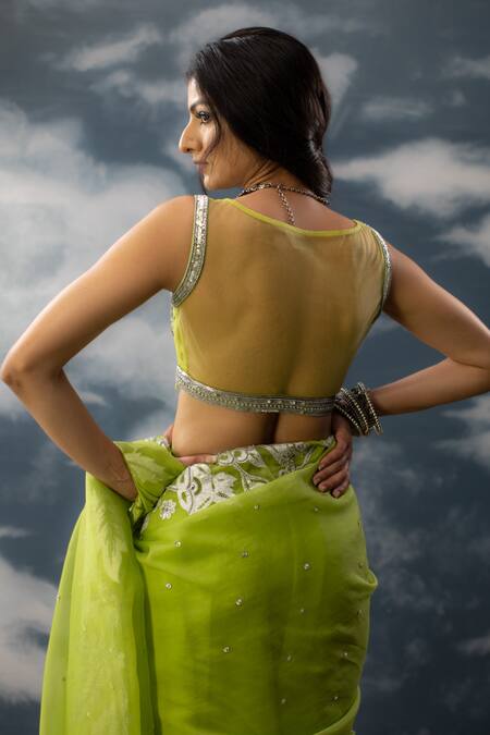 Green blouse featuring illusion round neck, sleeveless design, and handcrafted silver metallic beads with varied sequins