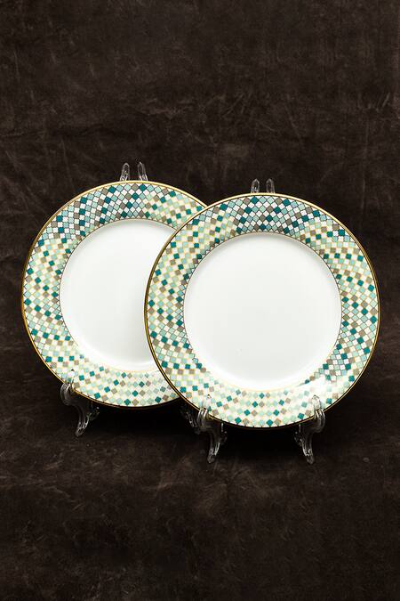 Teal dinner set with tile print on border, including 6 round shaped dinner plate, 6 quarter plate, an oval platter, 6 veggie bowl, 2 salad bowl, 6 soup bowl & 6 soup spoon.