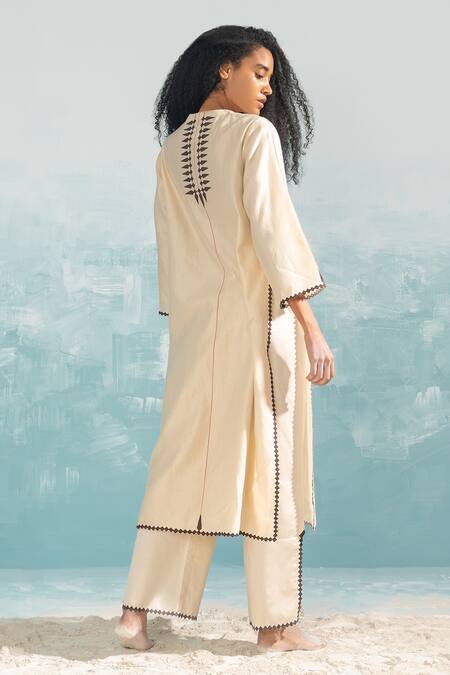 Beige kurta featuring geometric contrast hand-cut applique work on the yoke and back