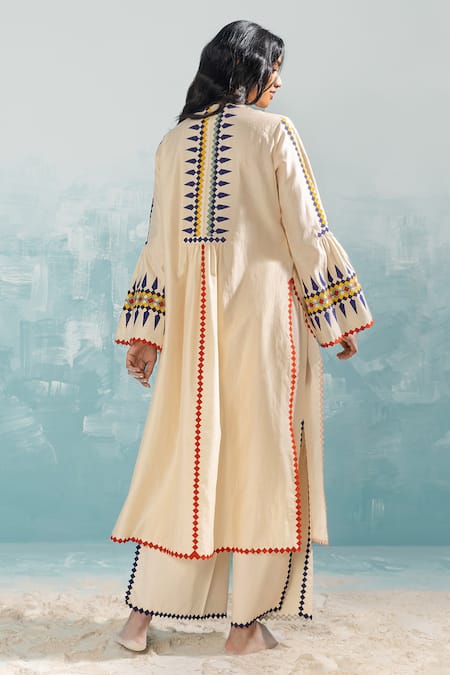 Keyhole cutout with loop button detail, Geometric pattern applique work, Side slits for ease of movement