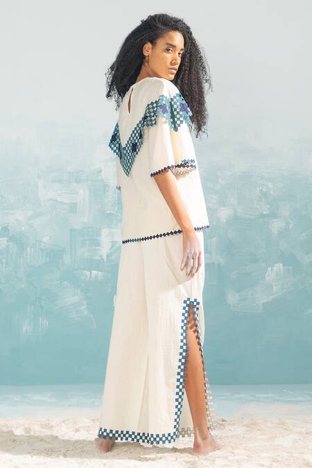 Ivory cape style top crafted from cotton silk chanderi featuring contrast hand-cut applique work on the front and sleeves