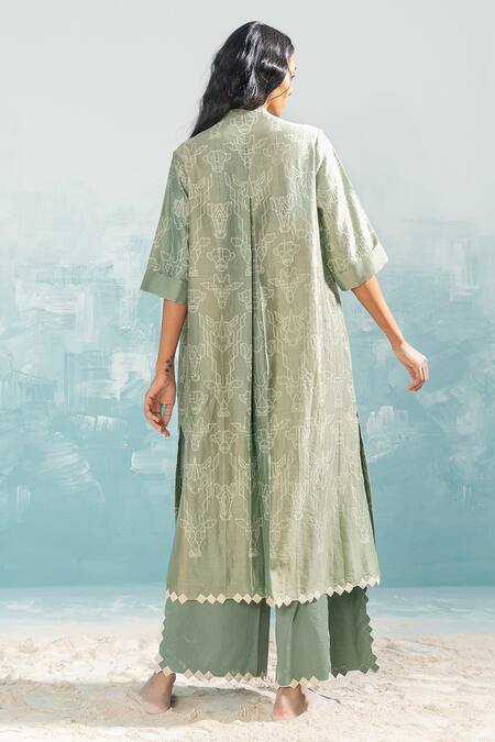 Granite green cotton pant featuring high slit and intricate cut-work details
