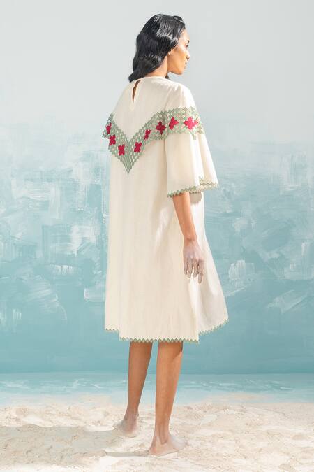 Ivory A-line dress made from cotton silk Chanderi featuring contrast hand-cut applique work on the front and hems