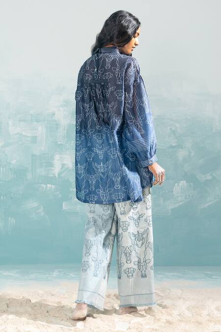Blue Cotton, Silk, Chanderi Embroidery Collared Nile Shibori Drop Shoulder Shirt