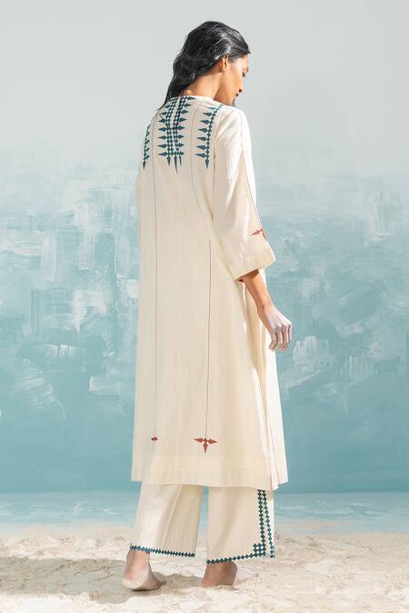 Ivory Cotton, Silk, Chanderi Round Neck Nile Tribal Applique Kurta